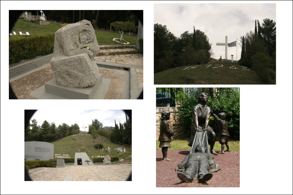 The Visitor is me. I have been to Kalavryta several times and it never fails to move me, but it was my first visit that had the most profound effect. I found myself alone on the hill, as the other tourists were exploring the memorial at the base of the hill. I had learned a little of what had happened that dreadful December day, and a scenario unfolded in my mind as if I was watching and hearing the massacre and its aftermath. It was so overwhelming I dropped to my knees and cried, and over the following week or so I was inspired to write these four poems from different points of view: a man who saved his son; a German soldier who had to follow orders; the wife who had to retrieve the man’s body from the hill; the visitor (ie me). My husband (who was a young child living not far from that town when the massacre happened) subsequently discovered the story I had seen could be verified, and the next time we visited a statue had been erected of a woman bringing her husband down from the hill on a blanket, watched by her two bewildered children. I was overwhelmed all over again.